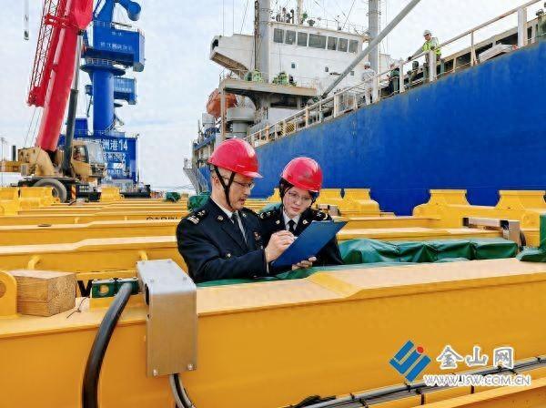 金山网讯近日,在镇江海关的监管下,江苏鼎盛重工有限公司出口至印度尼西亚的一批大型集装箱起重设备顺利装载“宝山之心”轮。针对该批设备件数多、体积大、难装卸的特点,镇江海关采取“一票一策”“边运抵边装运”等便利措施,助力设备顺利出口。(马达明理文清黄帅摄影报道)