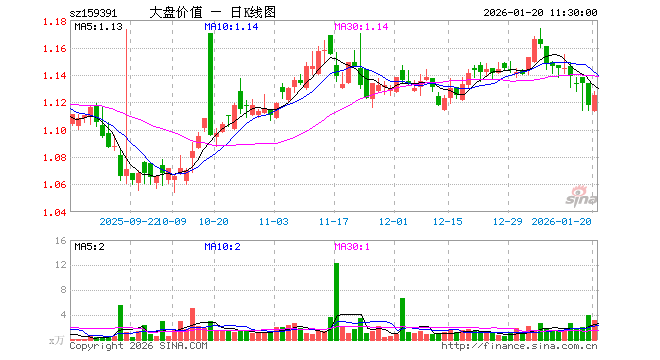 1月20日,截止午间收盘,大盘价值ETF博时(159391)涨0.63%,报1.125元,成交额344.57万元。大盘价值ETF博时(159391)重仓股方面,中国平安截止午盘涨1.57%,招商银行涨0.99%,美的集团涨1.65%,兴业银行涨0.00%,工商银行涨0.00%,国泰海通涨0.45%,农业银行涨0.42%,格力电器涨1.78%,伊利股份涨0.30%,交通银行涨0.88%。