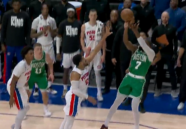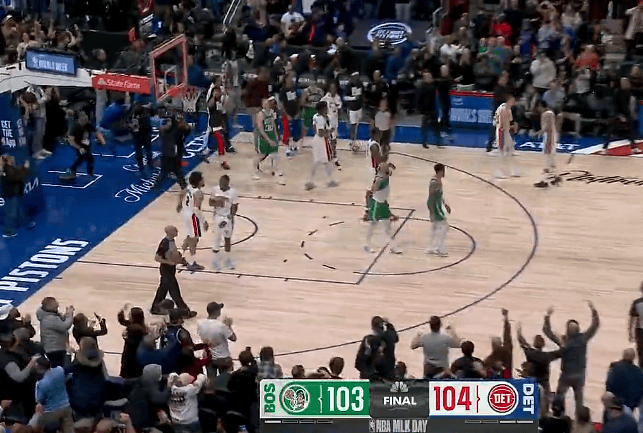 杰伦-布朗翻身跳投弹出篮框,凯尔特人103-104不敌活塞