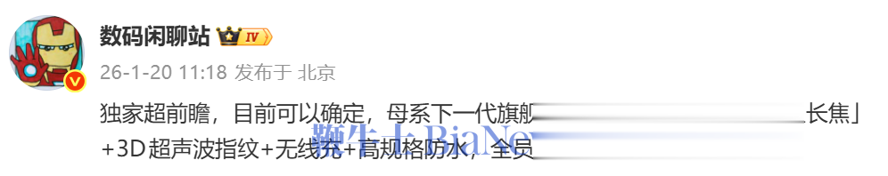 1月20日,据“数码闲聊站”透露,母系下一代旗舰实现了全员标配「潜望长焦」+3D超声波指纹+无线充+高规格防水,全员标准版将迎来一波大增强。
