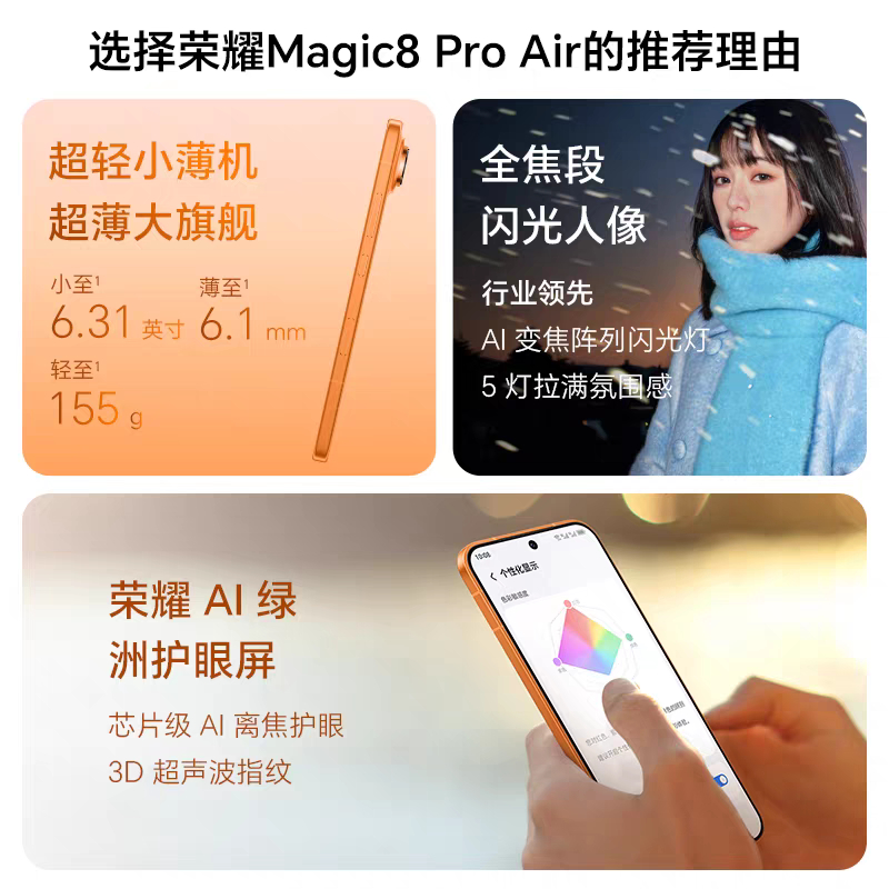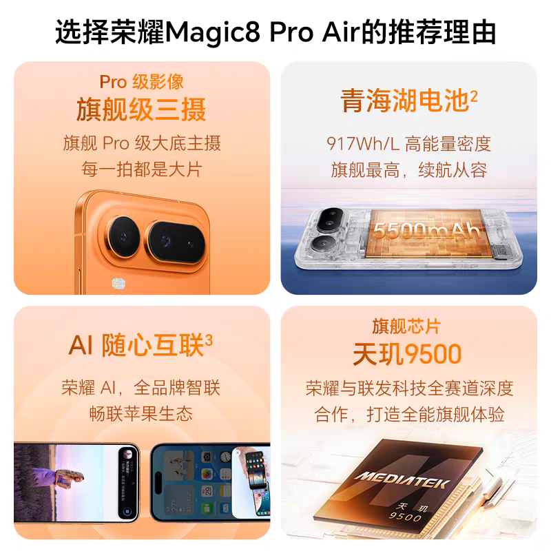 数码闲聊站荣耀Magic8 Pro Air正式发布,售价4999元起!1.处理器:天玑9500+LPDDR5X+UFS4.1 !2.屏幕:6.31 英寸 1.5K 120Hz LTPO OLED 绿洲护眼屏,4320Hz 超高频 PWM 调光!3.影像:前置5000w,后置5000w主摄+5000w超广角+6400w潜望长焦三摄!4.续航: 5500mAh+80W有线快充+50W无线快充!5.其他: MagicOS 10,3D超声波指纹识别,红外 、NFC、线性马达、立体声扬声器,IP68 / IP69 防尘防水,仙紫、轻橙、羽白、影黑四色,12+256GB 4999元起!