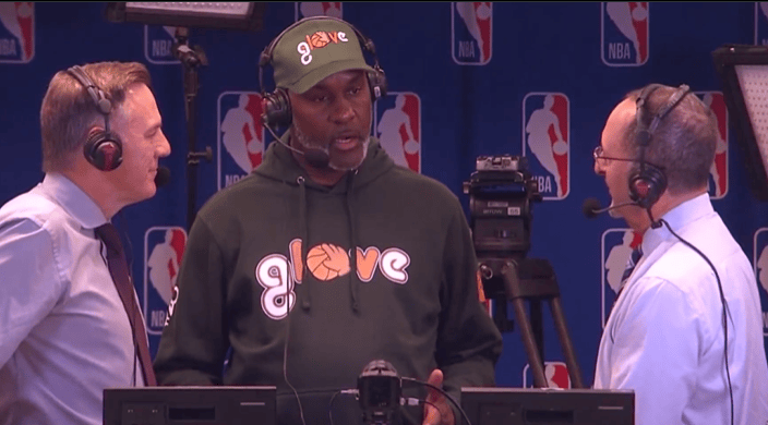 比赛暂停期间,勇士球员小加里-佩顿的父亲加里-佩顿接受采访谈2006年总冠军:
