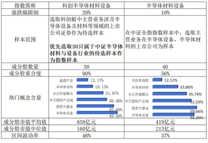 3.“科创半导体材料设备”涨跌幅限制20%波动更大,“半导体材料设备”限10%走势相对平稳