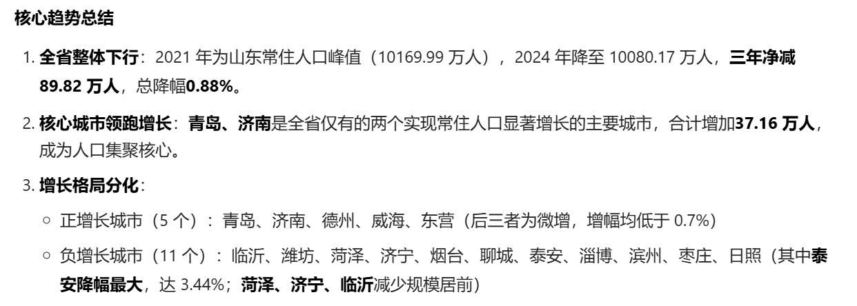 山东2021年-2024年(2025数据还没出)常住人口变化,减少89万人!! 只有济南青岛保持较强的人口增长,分别是:青岛涨幅18.58万,济南涨幅17.89,在全国也排在前列。 而像山东第三城的烟台,人口却持续下滑,流失了吃惊的8.8万人。 除济南青岛外,只有威海,德州,东营取得了微量增幅!! 各自涨幅1万左右! 山东3年流失89万人,真是触目惊心啊!!