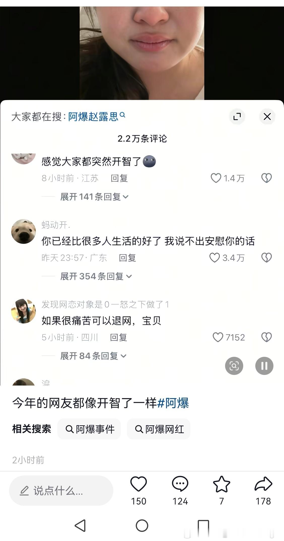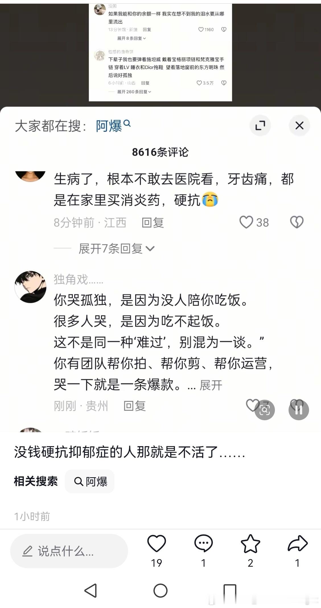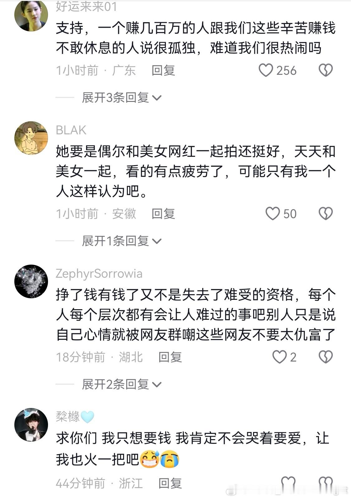 阿爆哭诉自己很孤独事件,这次网友态度都很一致啊,你一个不为金钱感到压力的网红怎么好意思哭诉,到处旅游玩玩就能把钱赚了。不想想多少人因为生活的压力压的踹不过气,别人都没哭诉不容易,网红就是赚太多了,闲的慌