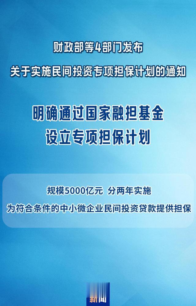 1月20日,财政部等4部门对外发布通知,明确通过国家融资担保基金设立专项担保计划,规模5000亿元,分两年实施。