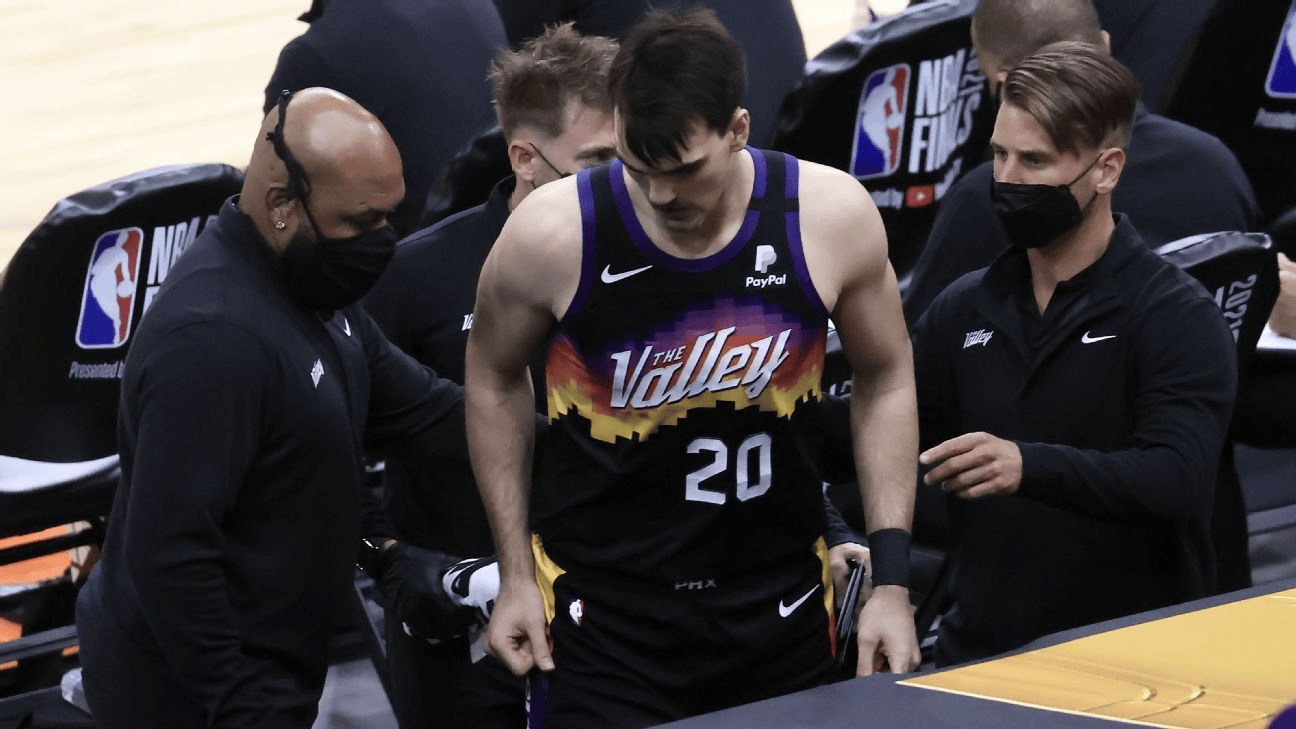 沙里奇曾在2021年NBA总决赛首战中受伤:那次他在一次跳停落地中右膝受力不当,随即被搀扶离场,之后确诊为右膝前十字韧带撕裂,直到22-23赛季才复出