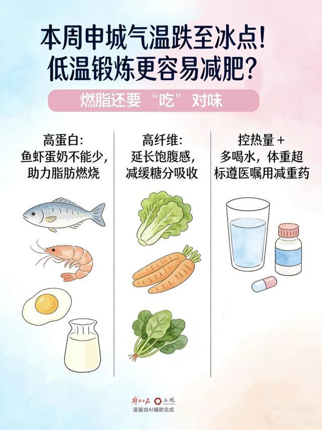 她最后提到,除了“动”,冬天减重人群也应同样关心如何“吃”,高蛋白、高纤维食物可助力脂肪燃烧,因此需要保证充足的蛋白质摄入,包括鱼、虾、鸡蛋、牛奶等;同时摄入足量的高纤维食物,延长饱腹感,减缓糖分吸收。“控制热量、多喝水,如已体重明显超标者,可在专业医生的评估指导下辅助减重药物干预,真正实现减重、降糖的双重目标。”