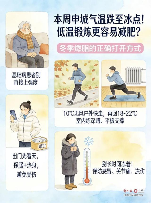 她建议,如果有心脑血管等基础疾病的患者,不宜直接“上强度”,“出门前先看好天气预报,确保衣物足够保暖,并做好热身,以免受伤。”在类似上海的气温环境中,可选择在约10℃、无风的室外步行、快走一段,让机体感受到适度寒冷刺激,再回到没有空调、暖气的室内进行一些无氧抗阻运动如深蹲、平板支撑等。“室内温度可控制在18℃至22℃,切莫为了快速燃脂让身体长时间处于寒冷环境,以免导致感冒、关节疼痛乃至冻伤。”