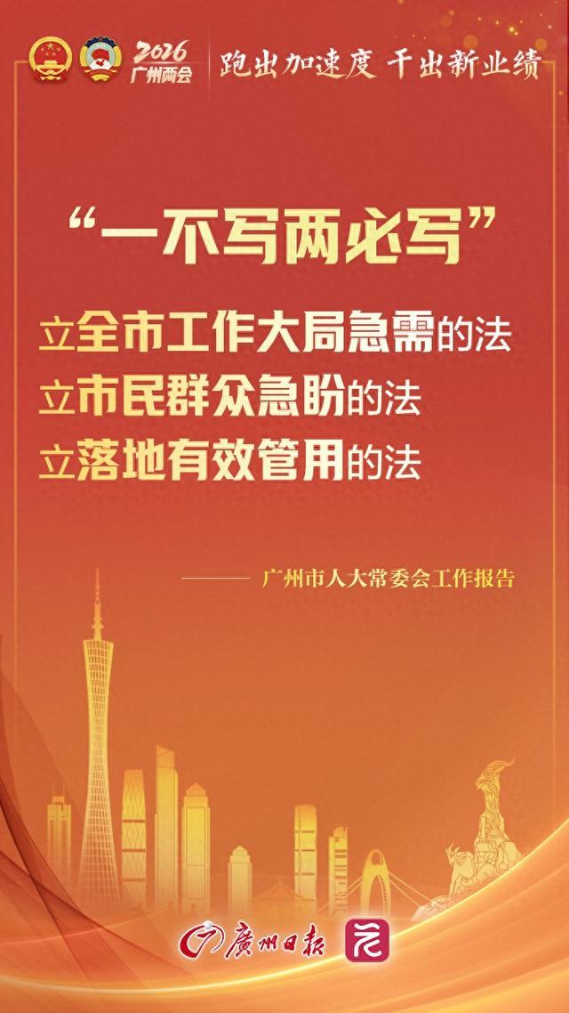 2026年,落实“一不写两必写”,立全市工作大局急需的法,立市民群众急盼的法,立落地有效管用的法。锚定新兴领域和工作急需加快立法,力争创造更多引领性、前瞻性、独创性立法成果,拟安排立法项目36个,包括制定人工智能发展促进条例、跨境电子商务促进条例等法规。认真研究粤港澳大湾区规则衔接、机制对接中的法律问题,以改革精神探索破解南沙方案落实、大湾区建设法律难题。