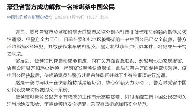 据悉,南非豪登省警察总监和约堡大区警察总监近日分别向驻南非使馆和驻约翰内斯堡总领馆通报:经警方全力工作,日前在索维托地区被绑架的一名中国公民已安全获救。警方成功抓捕8名嫌犯,并缴获作案车辆和枪支。警方将继续全力侦办案件,将犯罪分子绳之以法。