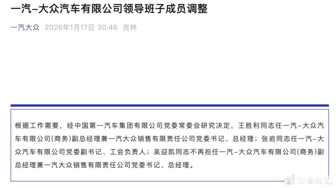 【一汽-大众领导班子调整,】1月17日,一汽大众汽车有限公司宣布,根据工作需要,经中国第一汽车集团有限公司党委常委会研究决定,王胜利同志任一汽-大众汽车有限公司(商务)副总经理兼一汽大众销售有限责任公司党委书记、总经理;张岩同志任一汽-大众汽车有限公司党委副书记、工会负责人;吴迎凯同志不再担任一汽-大众汽车有限公司(商务)副总经理兼一汽大众销售有限责任公司党委书记、总经理。值得一提的是,就在半个月前,一汽-大众刚刚宣布了一项重大人事变动,中国一汽党委常委、副总经理陈彬同志不再兼任一汽-大众汽车有限公司党委书记、总经理;董修惠同志任一汽-大众汽车有限公司党委书记、总经理。大v聊车车评观察