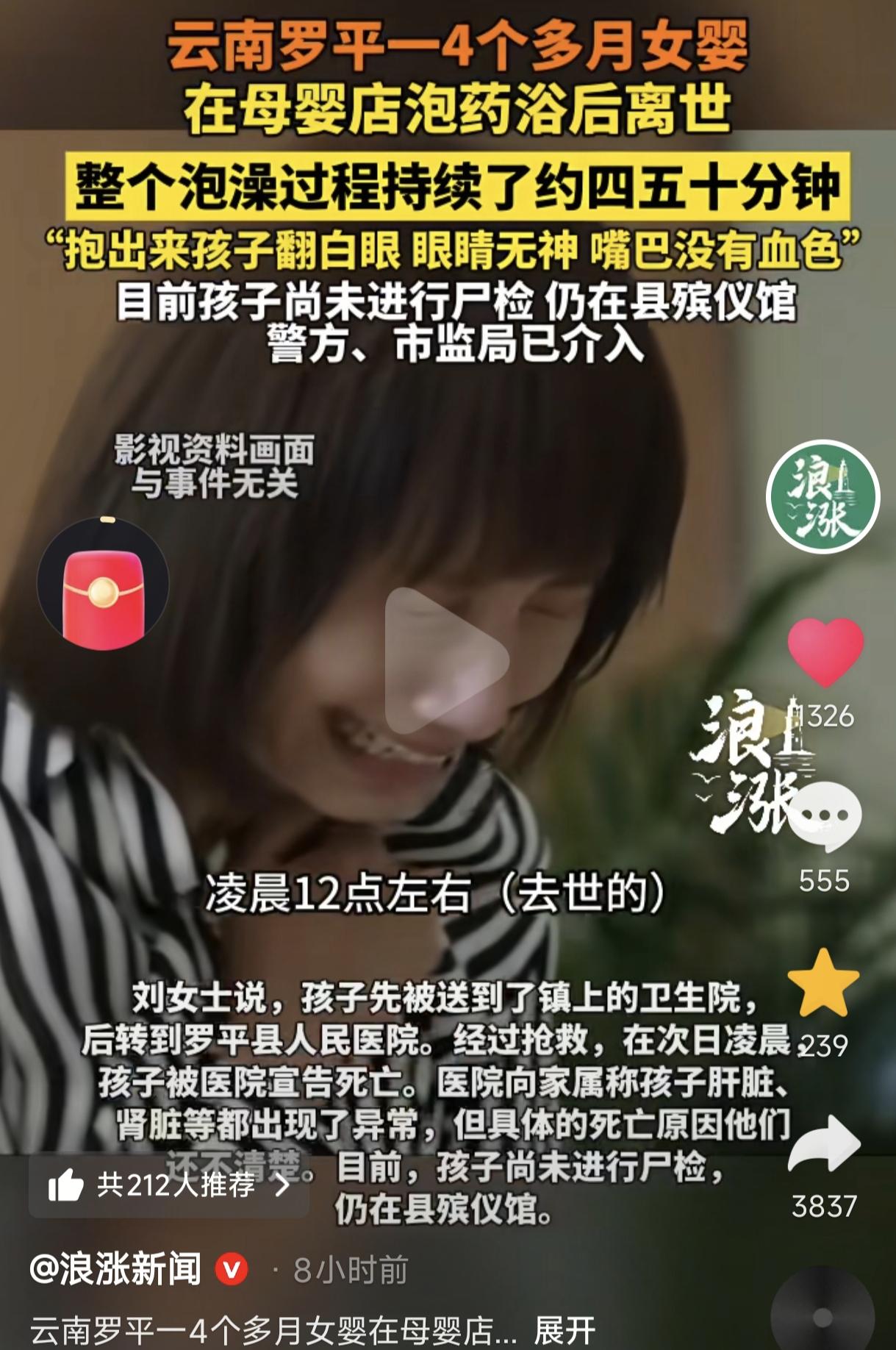 “太痛心了!” 云南4个月女婴泡药浴后离世,母亲称女儿泡了40多分钟抱出来后,人已经翻白眼,双眼无神,嘴唇发白了,店员称孩子是想睡觉了让母亲抱一会缓解缓解,但母亲仍觉不对劲,赶紧送医院抢救,但终是没能挽救回女儿的生命,女儿幼小的生命永远定格在了凌晨12点多。 (来源:极目新闻等) 1月16日,云南罗平,刘女士4个月大的女儿因感冒好几天没好,还时常咳嗽,就经朋友推荐,去当地马街镇的一家母婴店给孩子泡药浴。 没想到,正是这一决定令她痛不欲生,后悔万分。 刘女士是于16日下午1点20分左右带孩子来这家母婴店的,当时店员往浴盆里放了一些不知名的药材,但具体是什么也没告知刘女士。 刘女士心想对方是专业药浴店就没细问,等药材放水里后,她用手去划拉一下水试水温,发现水温有些高就对店员提出质疑,店员却称药浴就是要这个水温才有效。 刘女士有些担心,就在旁边看着女儿,刚开始女儿有点哭貌似在拒绝,她就用手拉了下女儿的小脚以安慰,女儿便没哭闹了,刘女士以为女儿适应了就没在意。 之后孩子泡着泡着就貌似睡着了,刘女士见孩子没有什么异常,这才放下心来。 直到40多分钟后,时间来到了下午2点10分左右,女儿被店员从浴盆里抱出来,刘女士一看,大感不妙。 因为这时的女儿已经双眼无神,还翻着白眼,嘴唇也毫无血色了,当场吓了一大跳,店员解释称孩子很可能是想睡觉了,让刘女士抱一会缓解缓解就好。 刘女士半信半疑,但还是接过孩子抱了一两分钟,在发觉孩子仍旧没有缓过来状态很糟糕后坚持送医抢救,店员这才帮忙给孩子穿好衣服紧急送到镇卫生院。 但是当地的卫生院医疗水平有限,于是刘女士只得将孩子紧急转送到罗平县人民医院抢救。 不料在抢救过程中,医生发现孩子的肝、肾脏都已经出现了异常,最终孩子抢救不治身亡。凌晨12点多,这位年仅4个半月大的女婴永远离开了人世。 孩子究竟因何而亡?目前还没有明确答案,如果要查出孩子的真正死因,估计下一步还要进行尸检。 目前警察、市监等部分正在进一步调查中,希望真相早日水落石出,以告慰这名无辜婴孩的在天之灵。 此案件,大众的焦点还是放在了那家母婴店上。据媒体披露,刘女士朋友孩子咳嗽在那家母婴店泡过,刘女士自己还问过店员说可以才带孩子去泡的。 对此,网友们热议不止。有网友说,泡澡不能超过20分钟,特别是药浴,最多15分钟,泡四五十分钟真是要命啊。 也有网友说,这母亲心太大了,大人泡半小时手都泡白,何况四个月大的婴儿,还是药浴,做大人的竟不知道,害了孩子也害了自己。 还有网友说,我家生两娃从不带他们去外面的任何地方泡澡,我都是在家给孩子们澡,也不会放乱七八糟的药包。 更有网友说,有宝妈说带孩子去游泳后能睡得好,我就听听不说话,自己在家洗个热水澡都可以好好睡觉了,干嘛去花那冤枉钱。 可怜天下父母心,最痛苦的莫过于刘女士了,她原本只想治好女儿的感冒与咳嗽,没想到却令孩子意外死亡,怕是一辈子都难以走出丧女之痛了。 而这家母婴店估计也是难辞其咎,比如,有没有医疗资质,有没有违规提供药浴,有没有操作不当,事后处置有没有延误,等等,这些问题都是不可忽视的。 而从此案例中,我们不难看出这家母婴存在的问题,如没有告知孩子母亲药村成分,水温不适当,药浴时间长达四五十分钟远超婴儿安全的5到10分钟,等等。 孩子母亲起初发现了问题,却没有引起警醒,还是大意了,如果当时发现了药材、水温、孩子哭闹等问题并加以制止,或许悲剧就不会发生了。 当然,母婴店药浴等服务更要加强监管,避免类似悲剧再次发生。“生命至上”,任何行业都要以“尊重与敬畏生命”为前提,切莫漠视法律法规,以免害人害己!