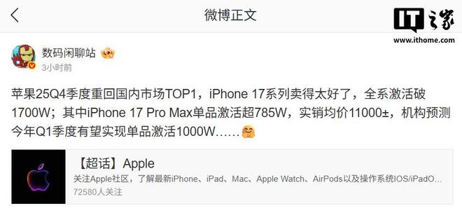 该博主还称,苹果2025年第四季度重回国内市场TOP1,iPhone17系列卖得太好了,全系激活破1700W;其中iPhone17ProMax单品激活超785W,实销均价11000±,机构预测今年Q1季度有望实现单品激活1000W。
