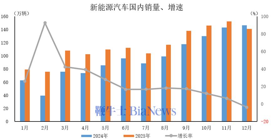 2025年12月,新能源汽车国内销量141万辆,环比下降7.4%,同比下降3.6%。