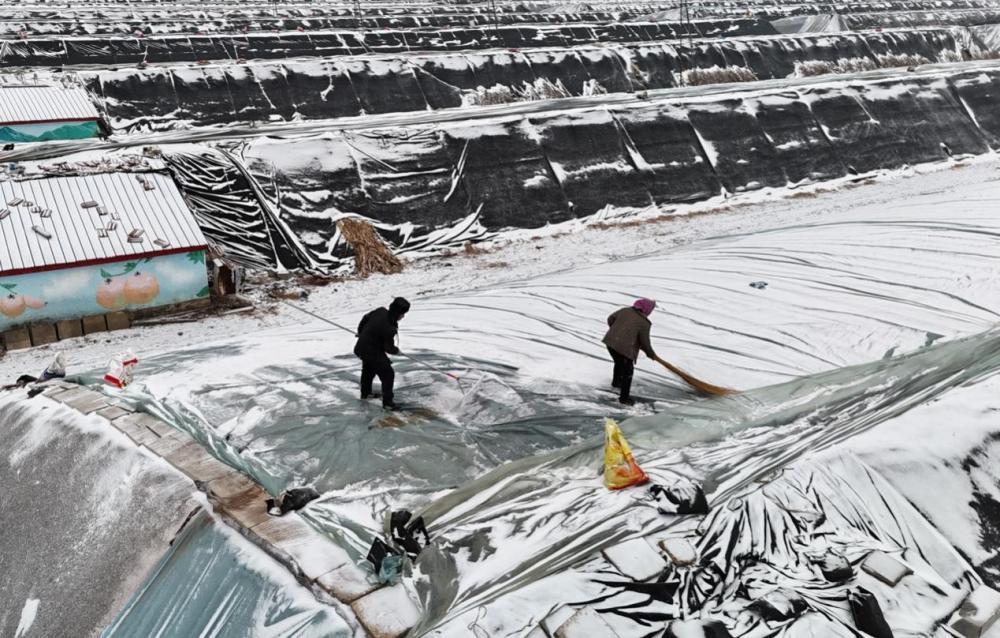 上图:2026年1月19日,山东省滨州市滨城区杨柳雪镇的农民在清理玉米囤苫盖上的积雪。(初宝瑞/人民图片)