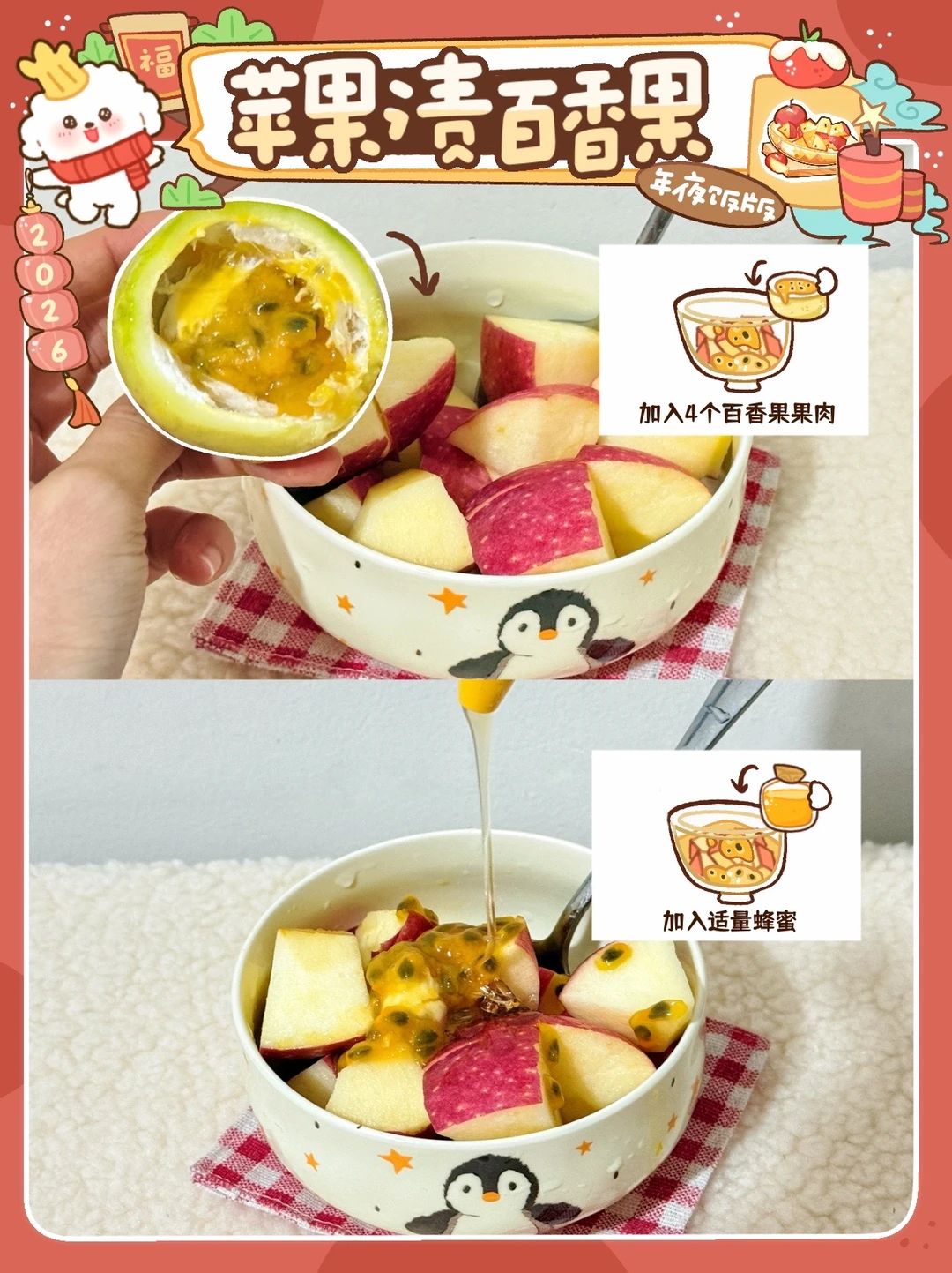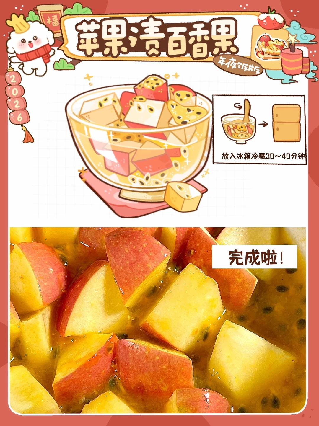 年夜饭桌上全是硬菜,吃到最后真的顶不住了! 还好提前备了这道苹果渍百香 果酸甜清爽直接封神! 🍎苹果渍百香(自制版) ⭐️材料准备 2个苹果+4个百香果+蜂蜜 1️⃣首先将苹果洗干净,切成块放入碗中,加入百香果果肉,加入蜂蜜! 2️⃣翻拌均匀,冰箱冷藏30~40分钟,苹果渍百香果就完成! 冰冰凉凉的,苹果吸满了百香果的香气 酸甜又解腻, 全家都抢着吃!