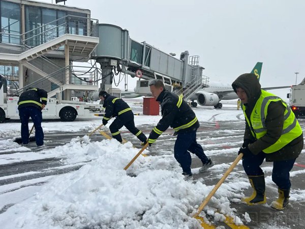 1月20日,扬泰机场各部门昼夜奋战,积极应对,出动吹雪车、撒布车、除冰车等保障车辆19辆,对跑道、滑行道、机坪开展除冰雪作业,全力保障降雪期间跑道、滑行道、停机坪符合运行标准。航空器除冰人员根据降雪情况开展航空器除冰作业,共保障航班35架次。在机械作业的同时,工作人员对机坪、廊桥、设备区等区域进行人工补位清理,确保航空器活动区全面恢复适航状态。同时,机场在公共道路、停车场等区域撒布融雪剂11吨,保障陆侧交通畅通。航站楼内,机场为老、幼、病、残、孕等特殊旅客开辟绿色通道,提供全流程帮扶,并加强现场巡视和引导服务,确保旅客在雪天出行中感受到温暖与顺畅。