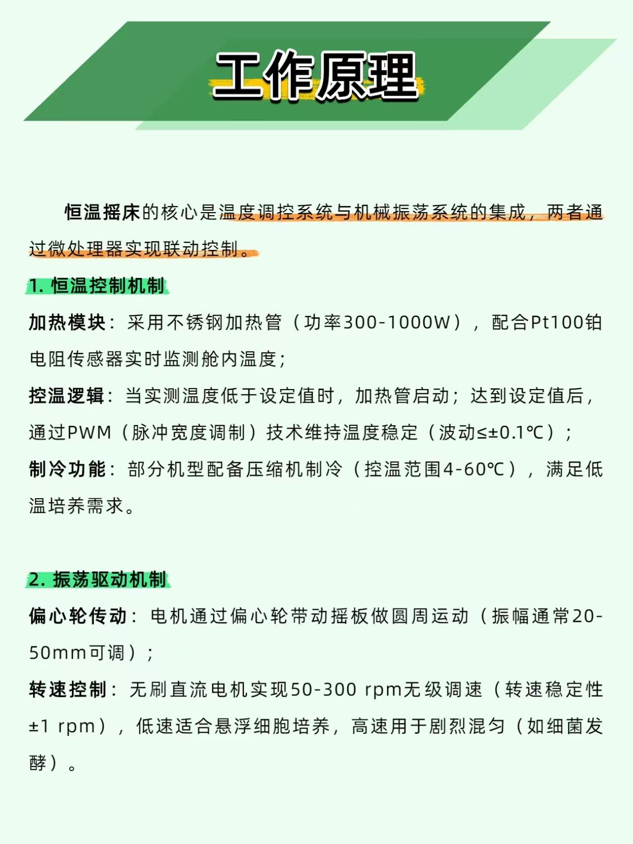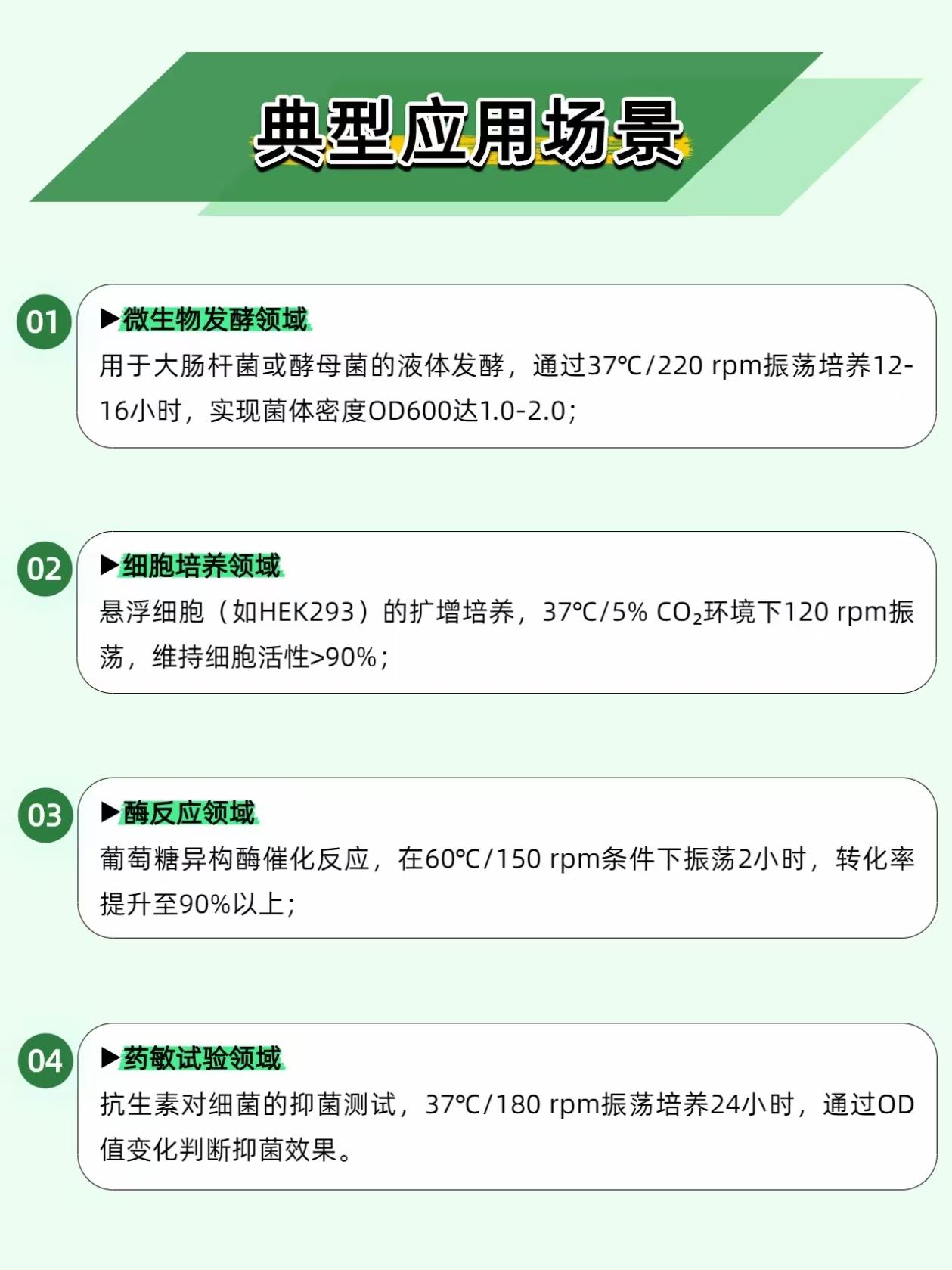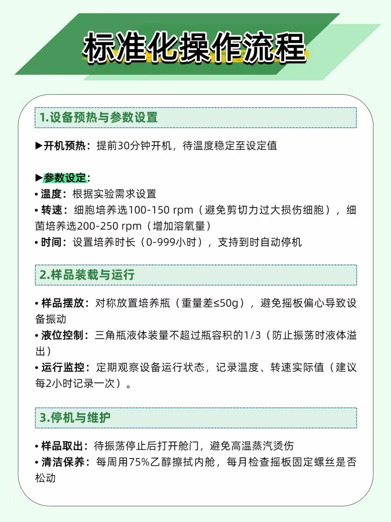 细胞培养总翻车?恒温摇床这几个坑你踩过吗! 实验室里养细胞、发酵细菌,最怕温度不稳、营养不均 —— 恒温摇床就是为解决这些痛点而生,一边精准控温(波动≤0.1℃),一边匀速振荡,让细胞 / 细菌在动态环境里长得又快又稳! ✅ 想用好它,这几点别瞎搞! 转速选对才不坑细胞:细胞培养选 100-150rpm(剪切力小,不伤细胞),细菌发酵选 200-250rpm(增加溶氧量,长得更快) 装样别太满:三角瓶液体量≤1/3,振荡时才不会溢出;对称摆放培养瓶,重量差≤50g,不然摇床直接震到噪音拉满 提前预热是关键:开机先等 30 分钟,温度稳定再放样品,避免温度波动导致细胞活性下降 💡 这些场景直接封神! ✅ 大肠杆菌发酵:37℃/220rpm 摇 12-16 小时,菌体密度 OD600 轻松达 1.0-2.0 ✅ 悬浮细胞培养:HEK293 细胞在 37℃/120rpm 下,活性稳定>90% ✅ 酶促反应:葡萄糖异构酶在 60℃/150rpm 振荡 2 小时,转化率直接飙到 90%+ ❗ 常见问题速解 温度波动大?检查舱门密封圈,加热管建议每 3 年换一次 噪音超大声?重新平衡样品重量,给轴承加润滑油 转速显示异常?联系厂家校准编码器或换电机控制板 你用恒温摇床时遇过最头疼的问题是什么?评论区唠唠~😉