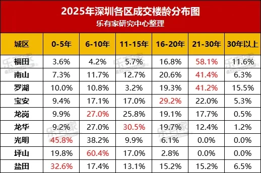 2025年深圳二手成交前20名小区均为配套成熟大型社区及优质次新小区,大多是刚需集中区域。楼龄在5年内的成交占比为8.9%,此前2023年该占比一度减少至6.2%。而11-15年和16-20年楼龄的占比则逐年下滑,其中16-20年楼龄的占比从2021年的30%降到如今的19.5%,大幅度减少10个百分点。证明如果大家有的选,还是会依旧优先选择新房子。