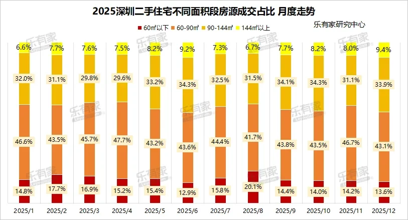 当前300-500万成交总价区间仍是市场交易主流,2025年每月占比在30%以上。总体来看,低门槛的刚需房源和高价值的豪宅房源,在当前市场越来越受宠。90㎡以上面积段12月底总占比43.3%,对比1月增加了4.7个百分点,而60-90㎡的占比则对比1月下滑了3.5个百分点,降幅最大。