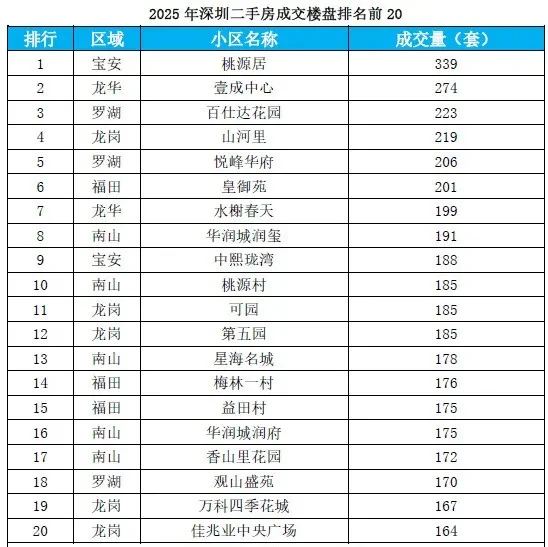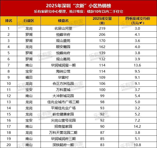 ✨以楼龄10年以内作为深圳次新小区的统计时间来看,2025年深圳一大批次新盘成交可圈可点。大家熟知的龙岗名居山河里、颐安麓园,罗湖的悦峰华府、悦峰尚府、观山盛苑、观山嘉苑,平均每月的交易量都有2位数。南山华润城润玺,宝安海纳公馆,福田华富村等,全年成交量也都超过100套。
