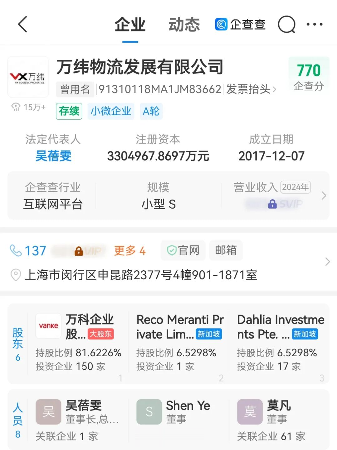 最近的一次,1月初,万纬物流发展有限公司被冻结股权数额2.5亿人民币,冻结期限为3年,执行法院为江苏省徐州市中级人民法院。万科对该公司持股81.6226%,属于绝对控股。