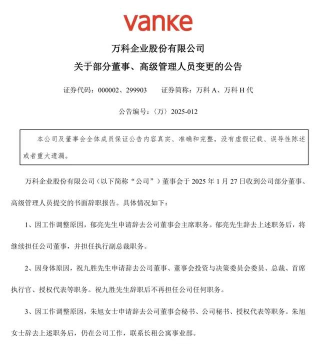 当然,早在2025年1月27日,郁亮已辞去万科董事会主席职务,转任执行副总裁,由深铁集团原董事长辛杰接任董事长,多位深铁系高管进入核心管理层。