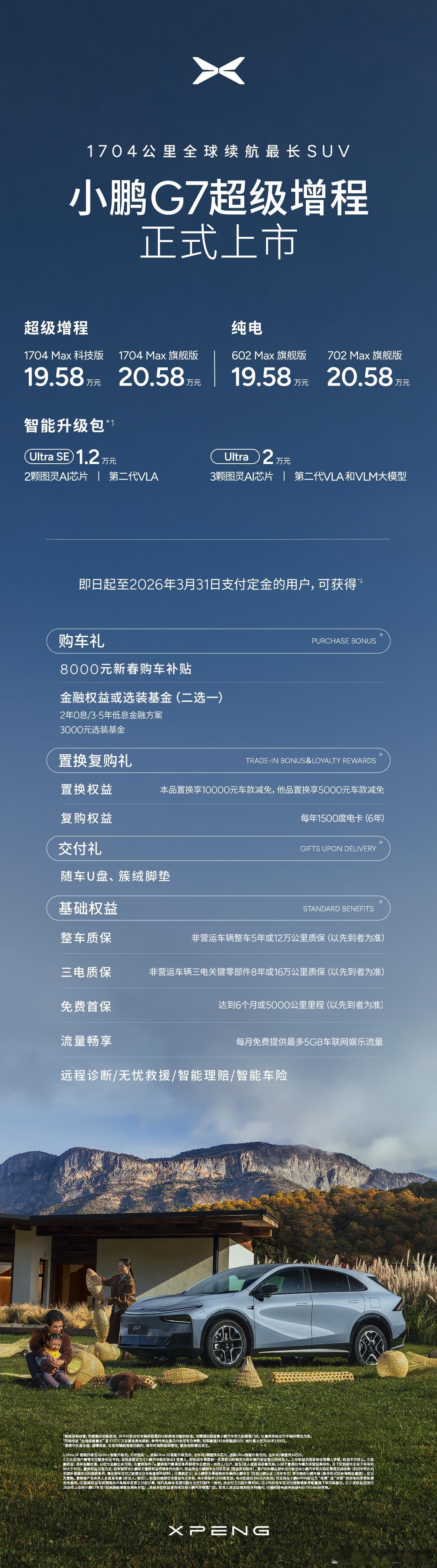 小鹏G7超级增程全系标配了主动降噪技术(ENC+RNC),增程器还用上了AI智能控制,启动和运行时的振动最多能降低50%。再加上全车关键部位吸音棉覆盖率超过90%,连增程器本身都做了超静音优化,单体噪音比行业主流低了10%。 测试人员用分贝仪测量,开着车窗、戴着主动降噪耳机,车内噪音显示是58.2分贝;而关上车窗、摘掉耳机,车内噪音反而降到了57.8分贝。换句话说,这台车本身的静谧性,已经堪比戴着降噪耳机的效果!CLTC光纯电续航有430公里,日常上下班充一次电能用一周;要是加上60升油箱,综合续航高达1704公里,也是目前全球续航最长的SUV。另外,截至2025年12月31日,小鹏全球累计布局超1000家销售网点;国内建成 721 家销售网点,海外已拓展至60国。充电网络同步拓疆,小鹏自营充电站累计达3150+座,覆盖430+城;海外充电网络接入31国。小鹏G7超级增程静谧性堪比降噪耳机小鹏全球销售网点突破1000家小鹏自营充电站突破3000座小鹏汽车