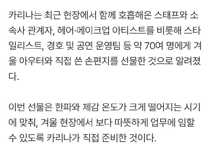 柳智敏给70多名工作人员送外套和手写信 柳智敏的暖心从来不是说说而已💛 韩媒报道她为现场工作人员、经纪团队、化妆造型师、警卫及演出运营团队等 70 多位工作人员,亲手准备了冬季外套和手写信当礼物,把身边每一位工作人员的付出都放在心上。人美心善的 Karina,这份细腻的温柔和真诚真的太戳人了~