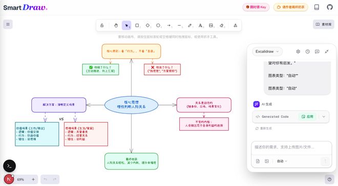 你只需要会用自然语言表达你的想法,它会把这些想法翻译成Excalidraw能理解的结构化指令,然后渲染成图。