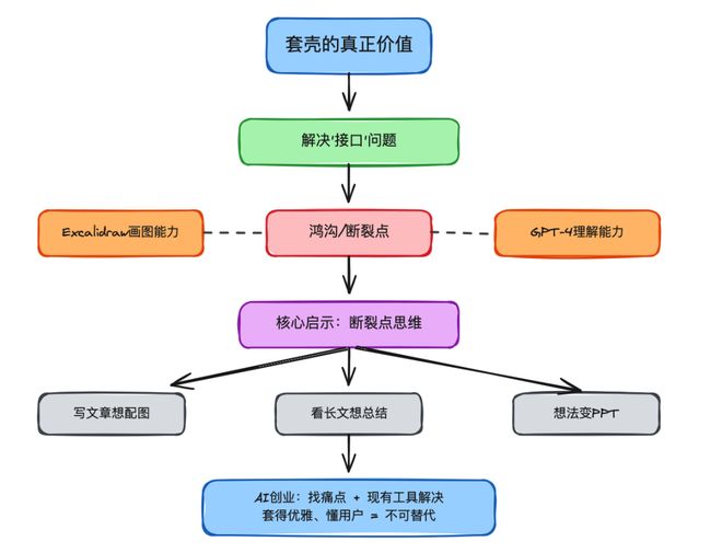 画图的能力,Excalidraw早就有了;理解语言的能力,GPT-4早就有了。但普通人想把这两者连起来,中间还差一个翻译层。