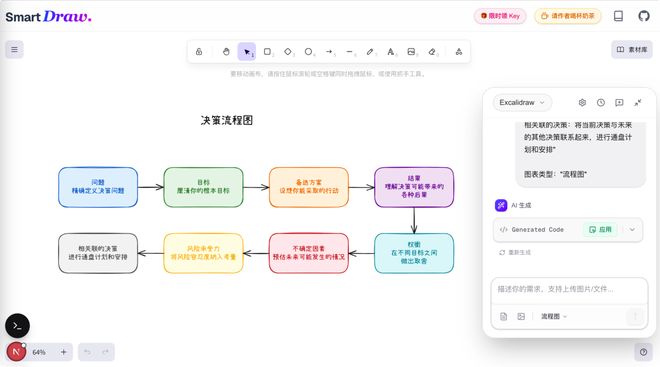 它生成的是Excalidraw格式的图表,手绘风格、视觉友好;同时因为是Excalidraw原生格式,你可以直接在Excalidraw里打开,随意拖动、修改、增删任何元素。