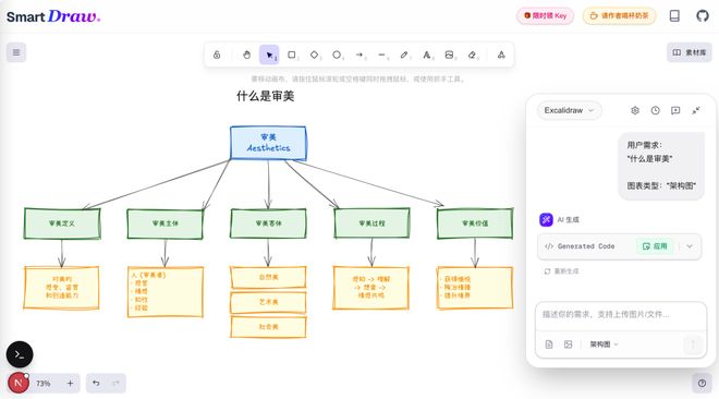 最关键的是,这张图我可以直接在smart-draw里打开编辑,如果我觉得「审美客体」这个节点的位置不太对,直接拖一下就调好了。