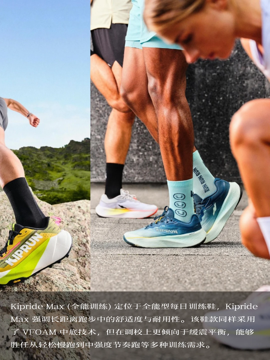 Kipride Max (全能训练) 定位于全能型每日训练鞋,Kipride Max 强调长距离跑步中的舒适度与耐用性。该鞋款同样采用了 VFOAM 中底技术,但在调校上更倾向于缓震平衡,能够胜任从轻松慢跑到中强度节奏跑等多种训练需求。