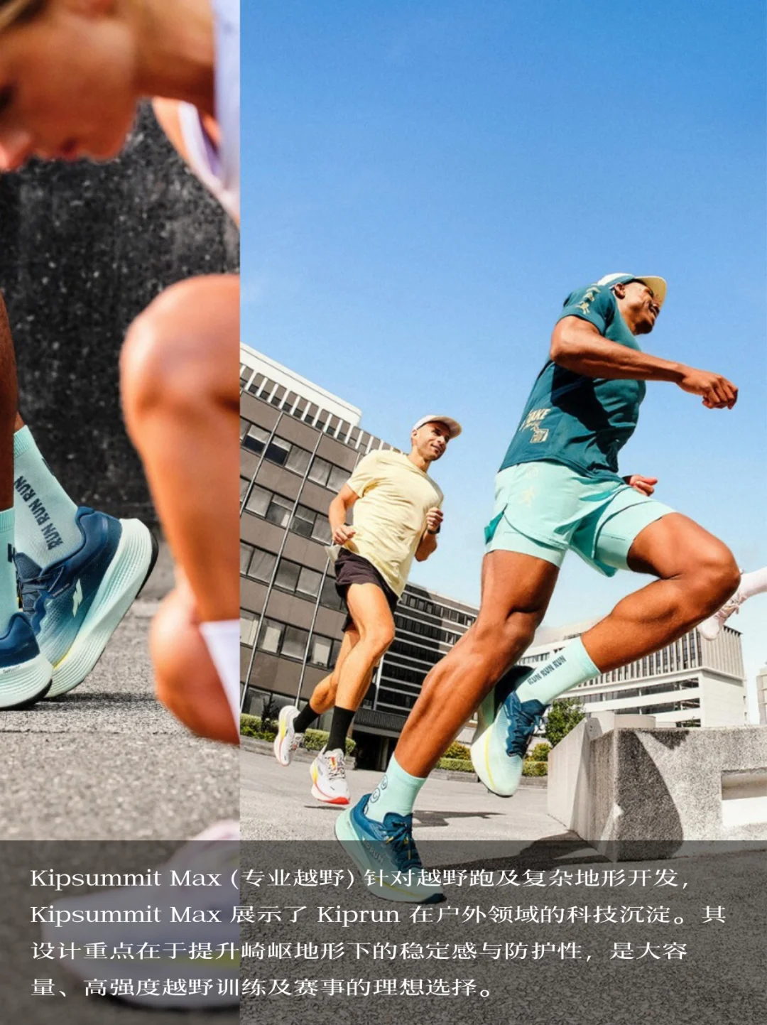 Kipsummit Max (专业越野) 针对越野跑及复杂地形开发,Kipsummit Max 展示了 Kiprun 在户外领域的科技沉淀。其设计重点在于提升崎岖地形下的稳定感与防护性,是大容量、高强度越野训练及赛事的理想选择。