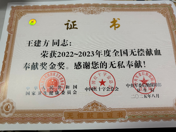 证书显示,王建方荣获2022-2023年度全国无偿献血奉献奖金奖。证书为国家卫生健康委、中国红十字会总会、中央军委后勤保障部卫生局联合颁发。他献血的事情,早已在同事中传开了。