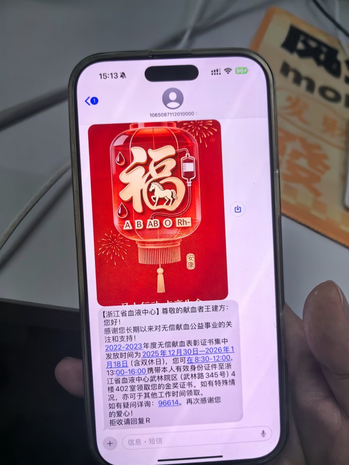 王建方近日接到浙江省血液中心武林院区的短信,说让他领取一份2022-2023年度无偿献血表彰证书,那本书也是一同领来的。
