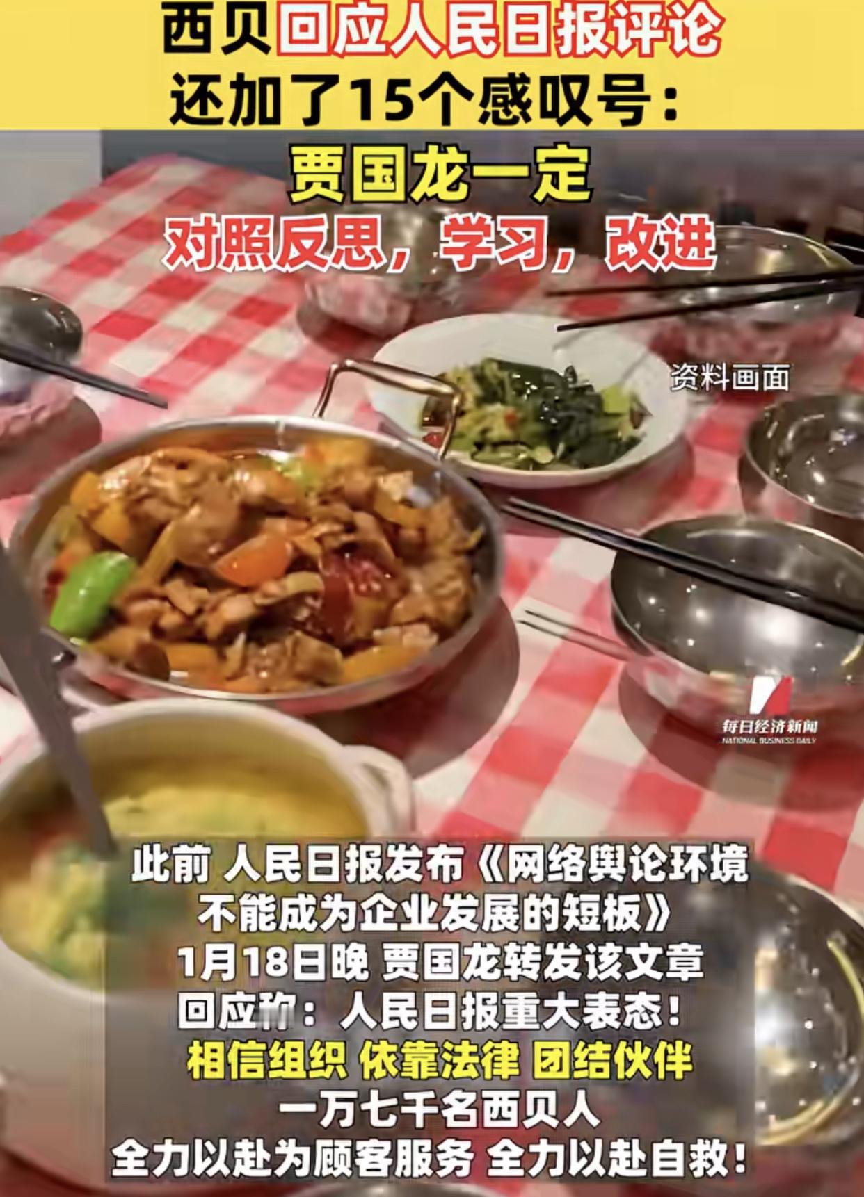 19日,人民日报再次回应西贝事件:“危机面前,诚信是最好的公关!” 此前曾表示:网络舆论不应成为企业发展短板!贾老板为之一振,连夜转发并配上:人民日报重大表态,相信组织,依靠法律,团结伙伴,一万七千名西贝人全力以赴服务顾客,全力以赴进行自救…… 而这次西贝回应:“西贝贾国龙一定对照反思学习改进!”一个字,一个感叹号!这表达又是什么心情呢? 其实,人民日报这一次给的很中肯,不听不服只能被市场抛弃,怪不了别人,这次贾国龙不反击了,算是识时务顾大局。衰在以前固执己见,一直以为自己的餐食品质价格很完美,其实问题很大,如果早反思,立即去改进,就不会如此被动。 (来源:每日财经新闻) 别人说你不好吃难吃都是就是做餐饮最失败的反馈,最好改正就是默默坚守做餐饮的初心,而不是不停的在风口浪尖蹦跶。