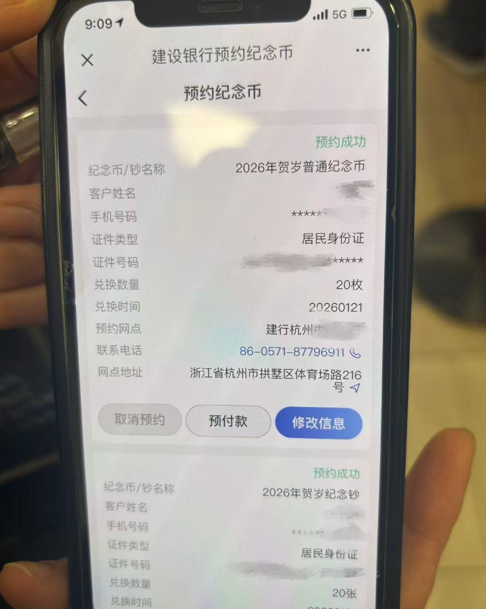 根据此前的公告,浙江省兑换工作由中国农业银行、中国建设银行和交通银行承办。上午,在杭州市区的一家银行网点,现场设置了专用兑换窗口,前来对兑换的市民已经排起长队,经过核对、清点等流程,市民喜气洋洋拿到了纪念币纪念钞。