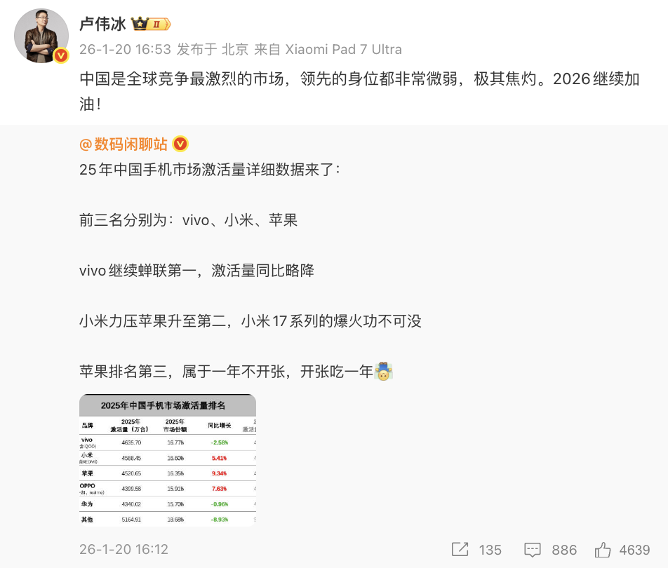 小米卢伟冰还转发了相关微博,称「中国是全球竞争最激烈的市场,领先的身位都非常微弱,极其焦灼。2026继续加油!」