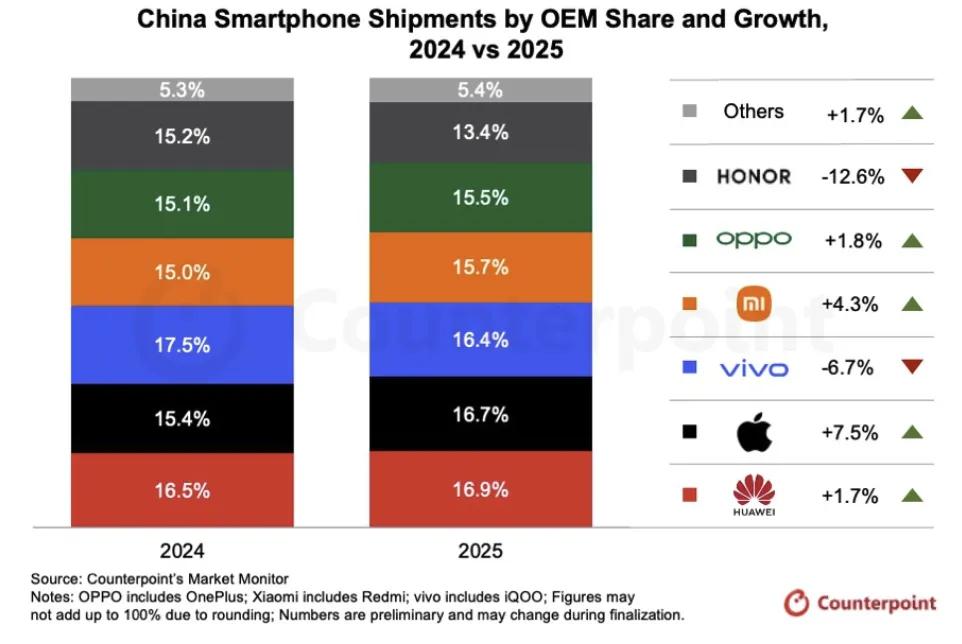 作为补充,上图是Counterpoint统计的2025全年出货量TOP6排名情况:❶华为(16.9%)❷苹果(16.7%)❸vivo含iQOO(16.4%)❹小米含REDMI(15.7%)❺OPPO含一加不含realme(15.5%)❻荣耀(13.4%)。供大家综合参考。