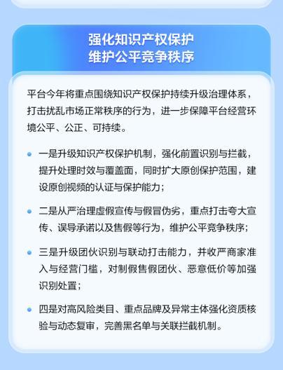 据了解,围绕知识产权保护持续升级治理体系,打击扰乱市场正常秩序的行为,也是今年商家扶持政策升级的一项重点内容。其中包括进一步从严治理虚假宣传与假冒伪劣,重点打击夸大宣传、误导承诺以及售假等行为,这既是维护消费者合法权益的需要,也是维护平台公平竞争秩序的需要。相关政策还包括:升级知识产权保护机制;升级团伙识别与联动打击能力;对高风险类目、重点品牌及异常主体强化资质核验与动态复审,完善黑名单与关联拦截机制等。业内人士分析认为,平台通过技术手段介入交易环节,既维护了公平秩序,也降低了商家的履约成本与心理负担,让商家能更专注于产品与服务本身。