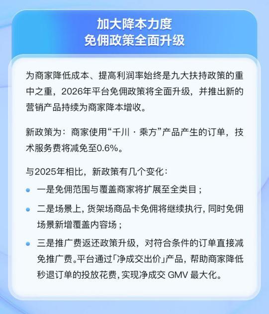 为商家降低成本、提高利润率是商家扶持政策的重中之重。据悉,2026年抖音电商平台免佣政策将全面升级,并推出新的营销产品持续为商家降本增收。