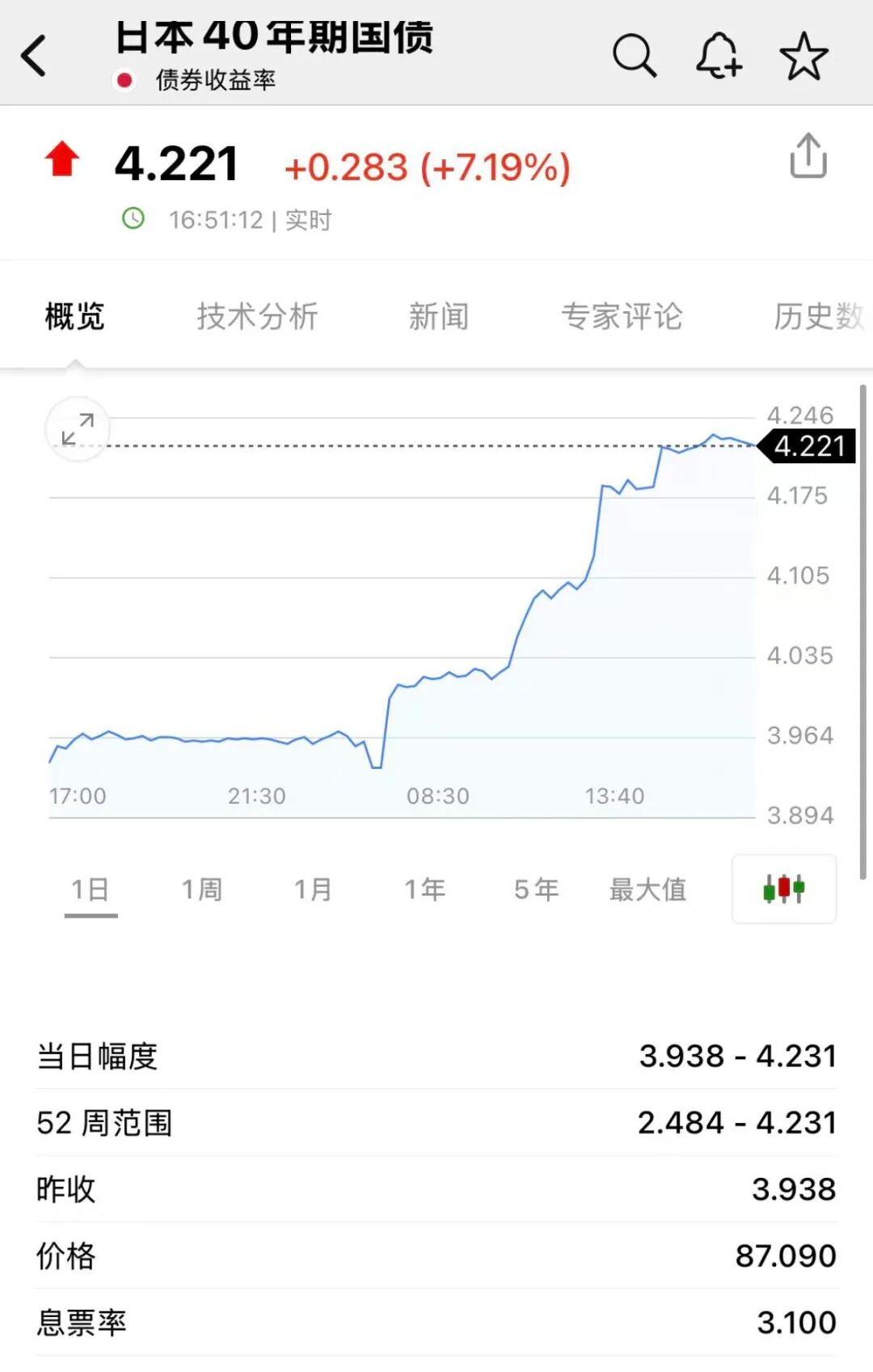 无独有偶,日债也在同一天遭遇历史性抛售,日本30年期国债收益率上升超30个基点至3.915%;日本40年期国债收益率更是触及4%的心理关口,上升29个基点至4.231%,续创历史新高,这也是该国主权债券三十余年来首度迈入“4时代”。