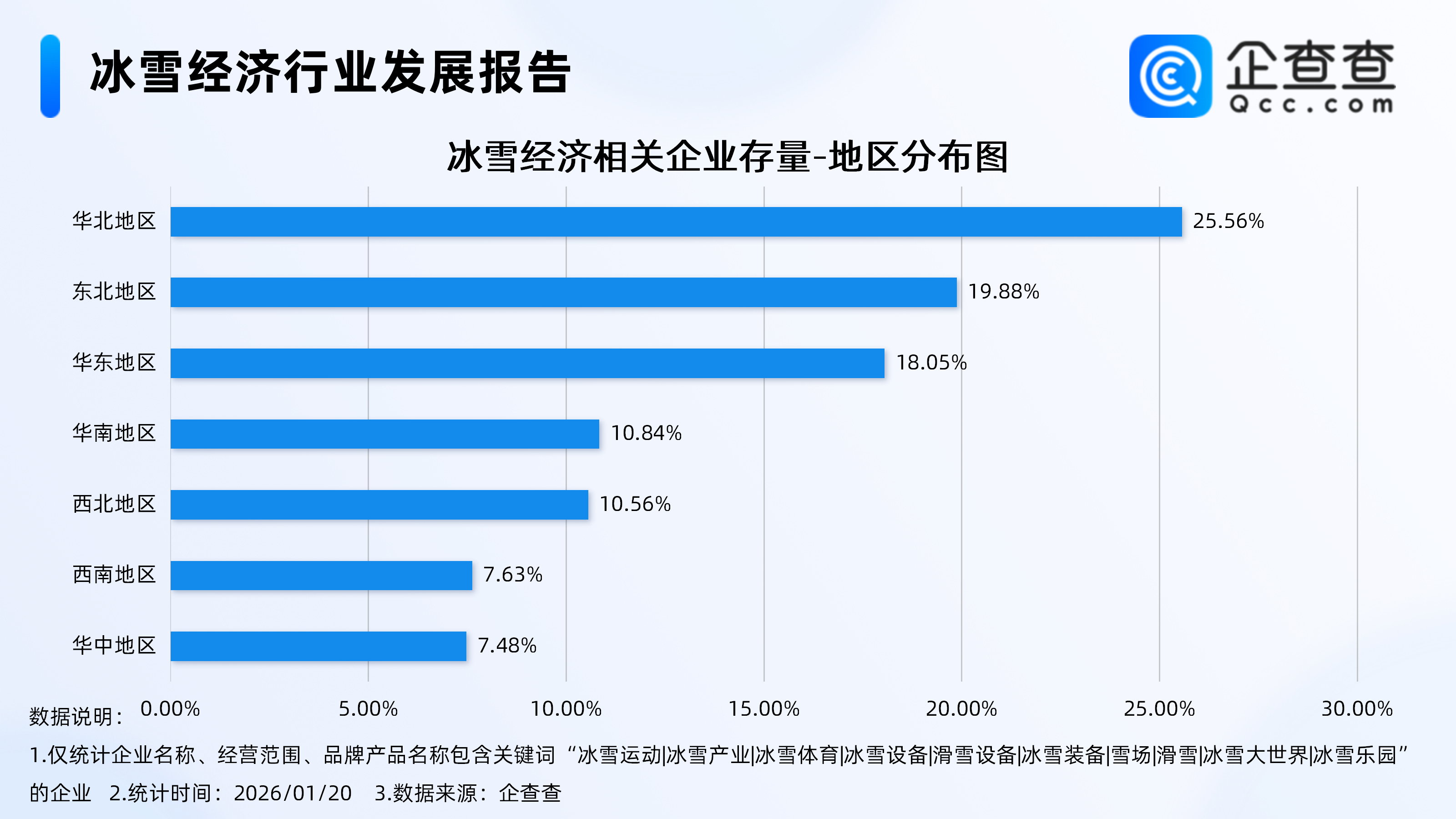 企查查数据显示,从地区分布来看,现存冰雪经济相关企业多分布在华北地区,占比达25.56%。其次,分布在东北地区、华东地区的冰雪经济相关企业分别占比19.88%、18.05%。