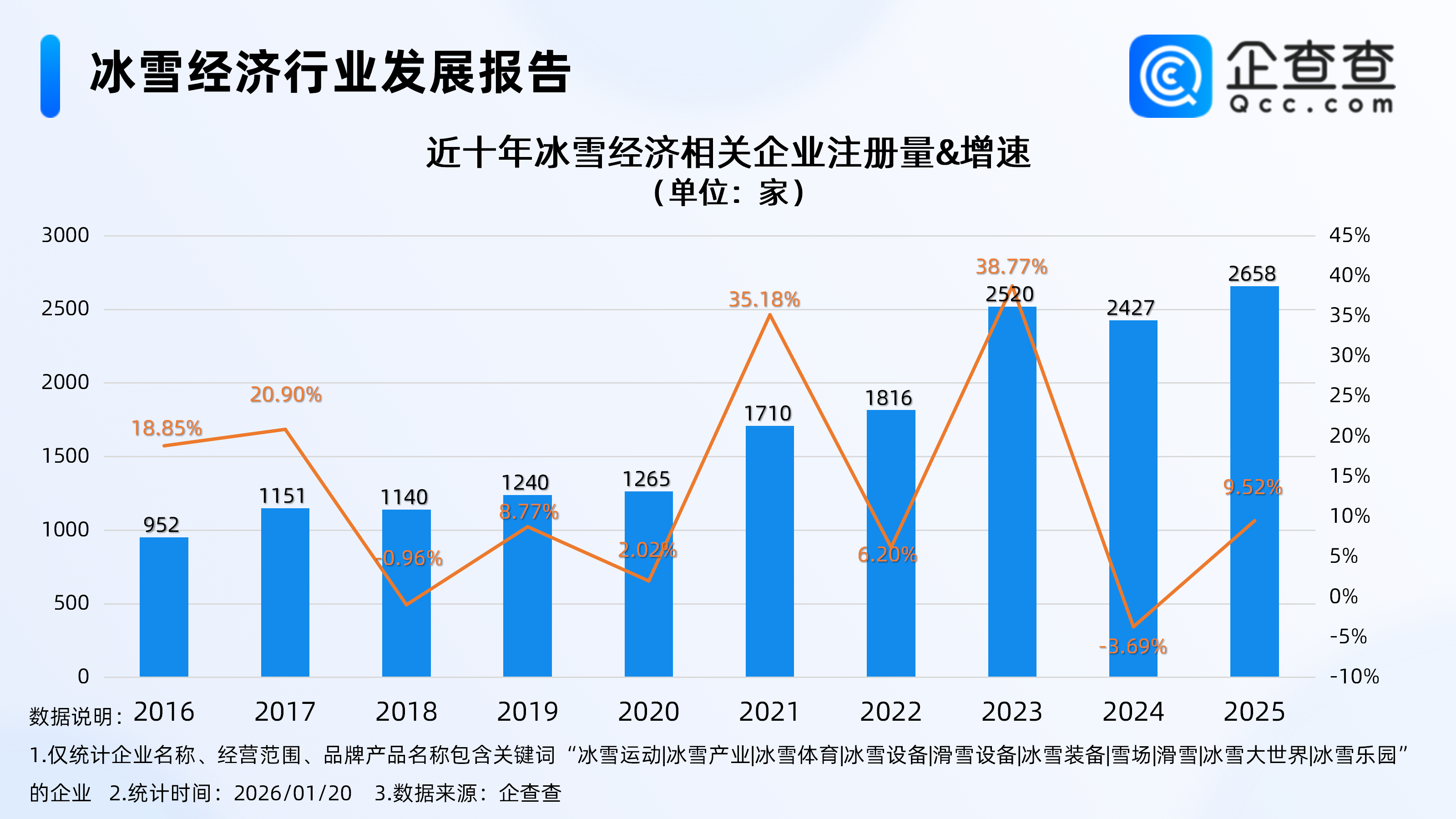 企查查数据显示,截至1月20日,国内现存冰雪经济相关企业1.5万家。近十年相关企业注册量呈整体增长态势,其中2023年-2025年连续三年注册量超2000家,其中2023年全年注册2520家相关企业,同比增长38.77%,达近十年第一个注册量峰值。2025年全年注册2658家冰雪经济相关企业,同比增长9.52%,创近十年注册量新高。截至目前,今年已注册113家相关企业。