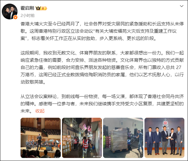 霍启刚表示,在这段期间,他收到无数文化、体育界朋友的联系,都很想出一份力。大家一起响应紧急住宿的需要,合力安排、派送各种物资。文化体育界也以独特的方式贡献自己的力量,例如前段时间音乐界朋友发起的慈善音乐会,所有门票收入总共27万港币,这周已经正式全数拨捐给殉职消防员的家属。