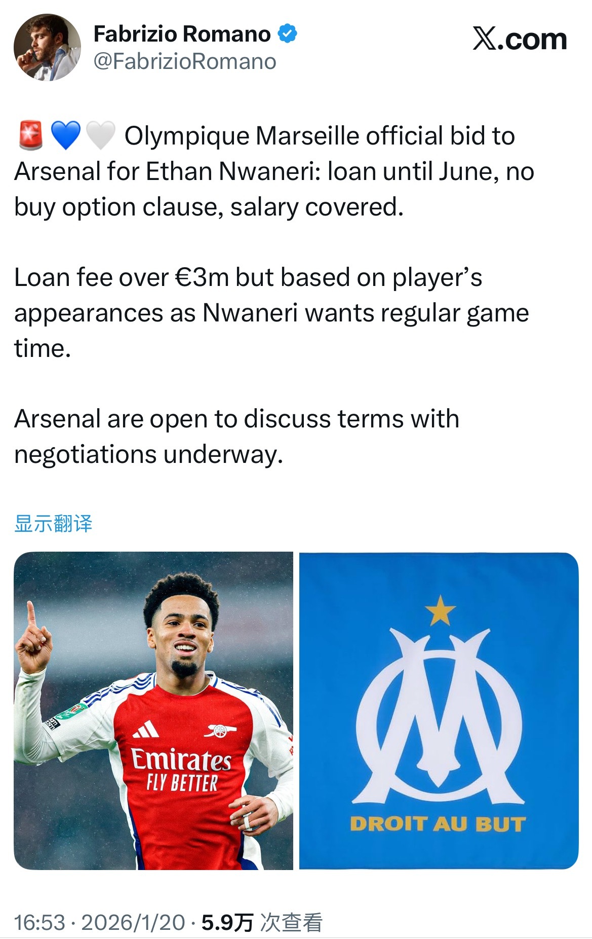 罗马诺:马赛正式向阿森纳报价求购恩瓦内里:租借至六月,无买断条款,薪水由马赛承担。租借费超过300万欧元,但根据球员的出场次数而定,因为恩瓦内里希望获得稳定的比赛时间。阿森纳愿意就条款进行讨论,谈判正在进行中。