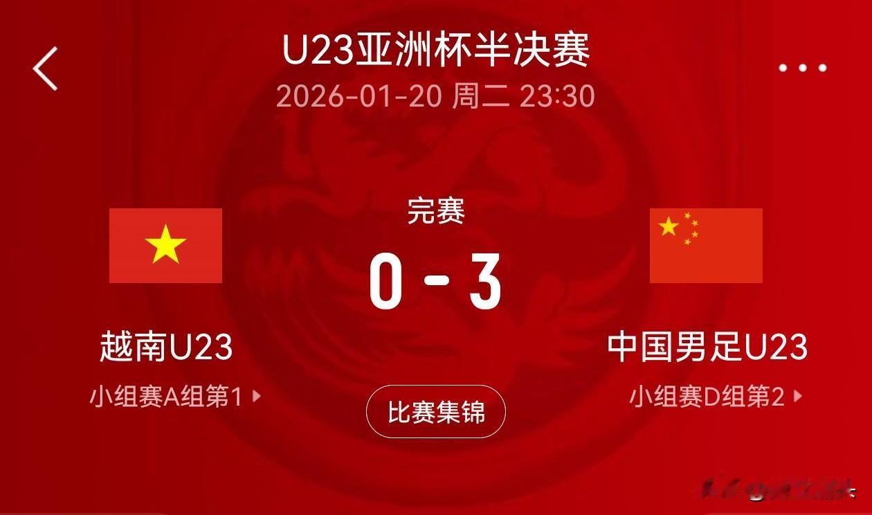 恭喜国足U23亚洲杯在创佳绩,创历史首次打进亚洲杯决赛,北京时间1月20日晚,U23亚洲杯半决赛,中国U23男足迎战越南U23。上半场门将李昊表现神勇,多次化解险情。易边再战,第65分钟彭啸头球破门打破僵局,5分钟后向余望扩大比分。补时阶段,拜合拉木助攻王钰栋锁定胜局。最终,U23国足3-0战胜十人越南,历史性首进亚洲杯决赛。北京时间1月24日晚23时,中国队将与卫冕冠军日本队争夺冠军。